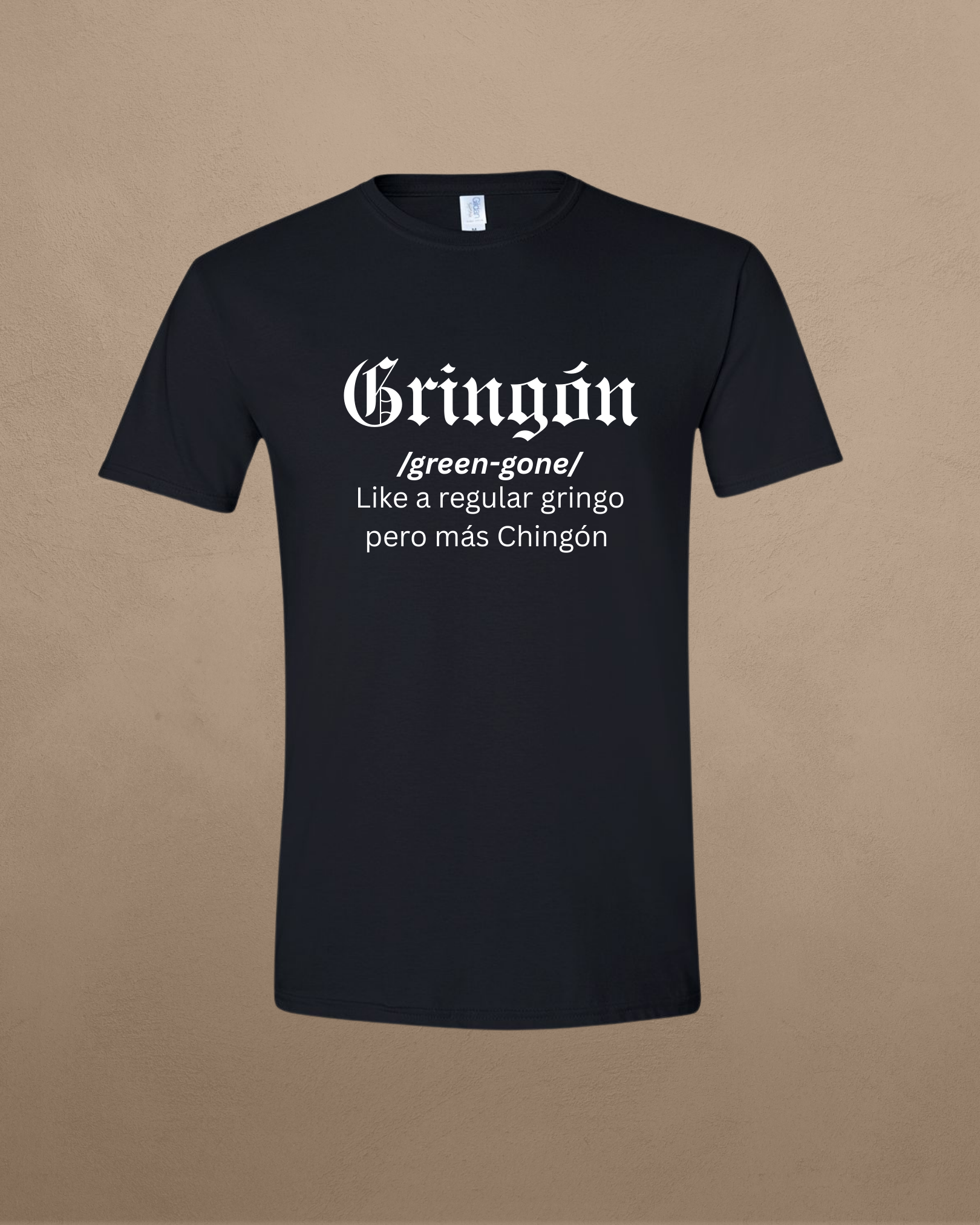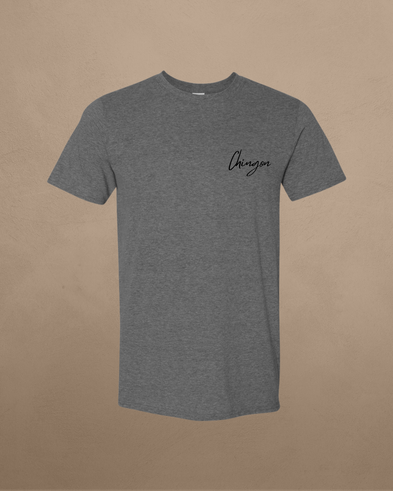 Size chart for a black t-shirt displaying measurements for size, length, width, and sleeve in inches, with a diagram of a t-shirt showing where to measure.